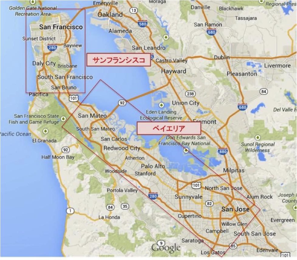 日本でよく言及されるシリコンバレーという地域は、アメリカではサンフランシスコ・ベイエリアと呼ばれる地域に当たり、いわゆるシリコンバレーであるベイエリアと、シリコンバレーに比べてかなり都会的なサンフランシスコは区別されることが多いです。